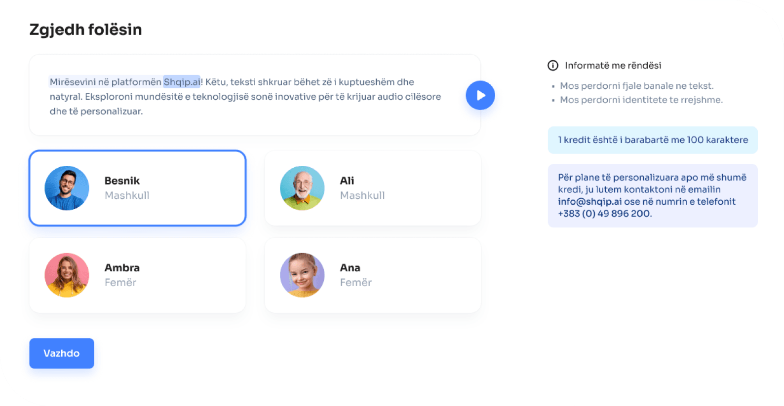 Ngarkoni tekstin dhe zgjedhni zërin tuaj të preferuar për ta dëgjuar. Konvertoni tekstin në zë për një përvojë të personalizuar dhe unike.